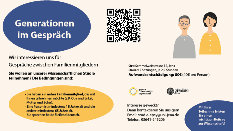 In der Entwicklungspsychologie interessieren wir uns für die gesamte Lebensspanne. Deshalb suchen wir regelmäßig StudienteilnehmerInnen aller Altersklassen.